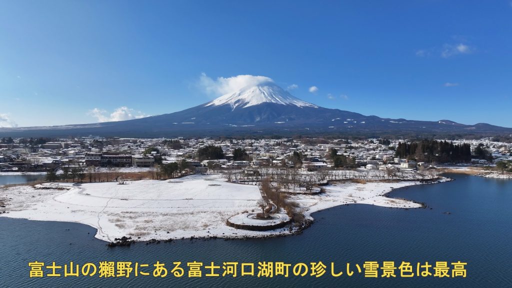 今回投降した動画を見て頂ければお分かりのように、裾野近くまで雪化粧した富士山と、そのすそ野にある富士吉田市にも雪が積もった冬景色。