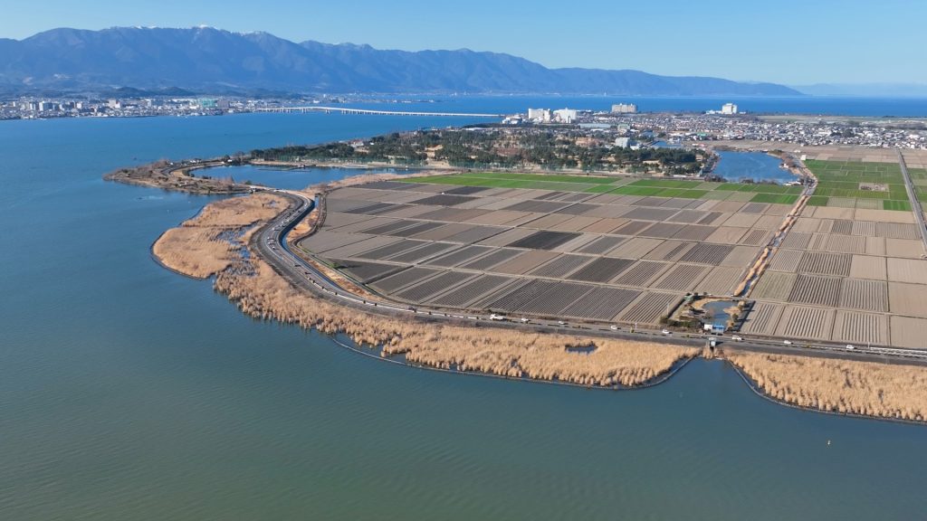 今回は、この烏丸半島を琵琶湖湖上から空撮しましたので、皆様にお届けします。
