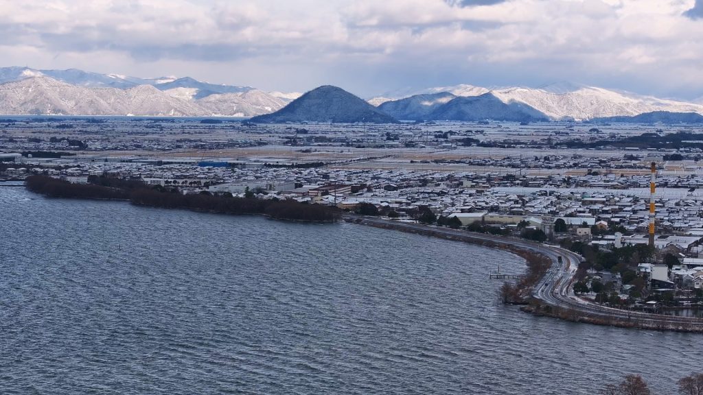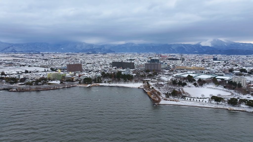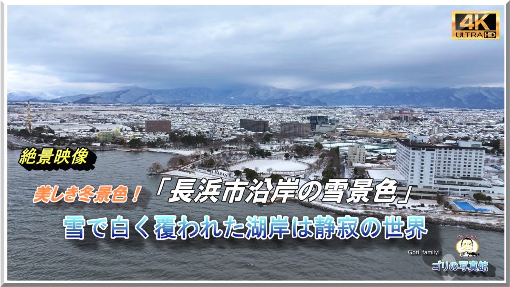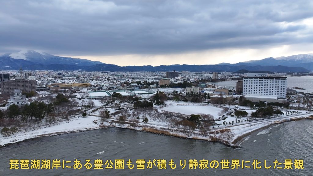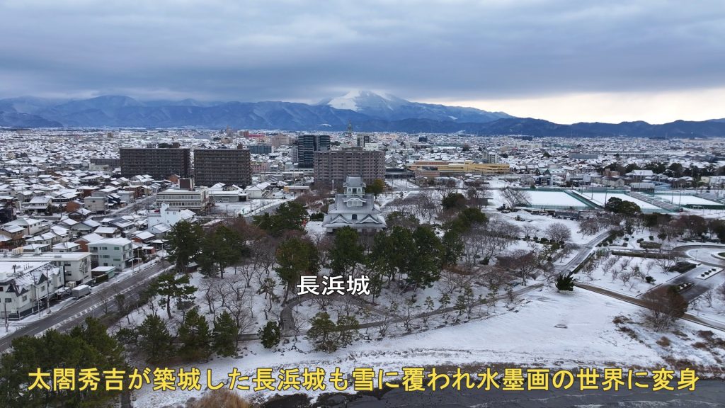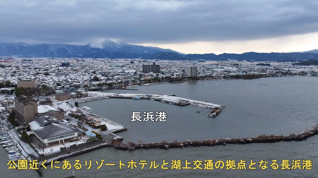 今回は、この長浜観光のシンボル的な存在感のある公園の雪景色を、琵琶湖湖上からドローン空撮しましたので、皆様にお届けします。